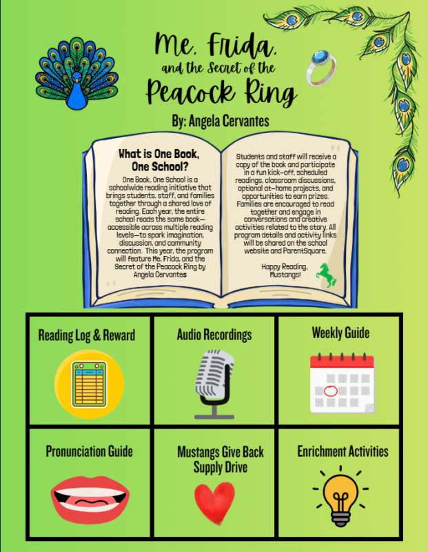 What is One Book, One School? One Book, One School is a schoolwide reading initiative that brings students, staff, and families together through a shared love of reading. Each year, the entire school reads the same book, accessible across multiple reading levels, to spark imagination, discussion, and community connection. This year, the program will feature “Me, Frida, and the Secret of the Peacock Ring” by Angela Cervantes.